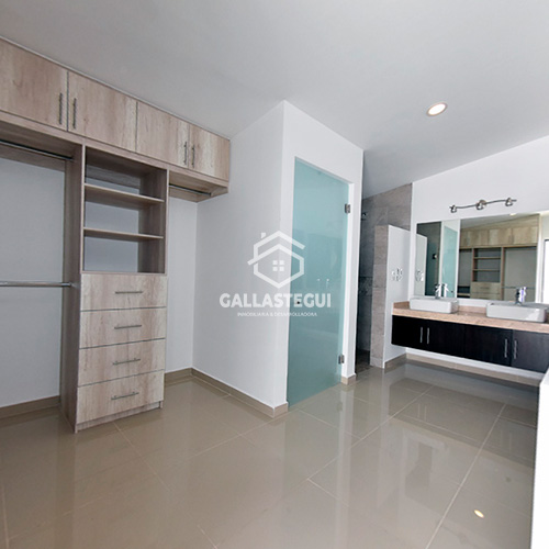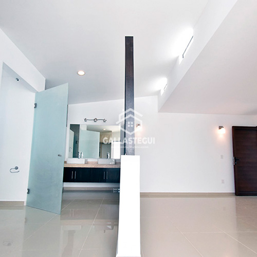 1er piso: Escaleras con vista panoramica, ventanal (doble altura), 2 recamaras, la principal (bonito diseño arquitectónico) con walk in closet y tocador privado, 3a habitación con vestidor y tocador privado. Asoleadero con vista al jardín (patio trasero).